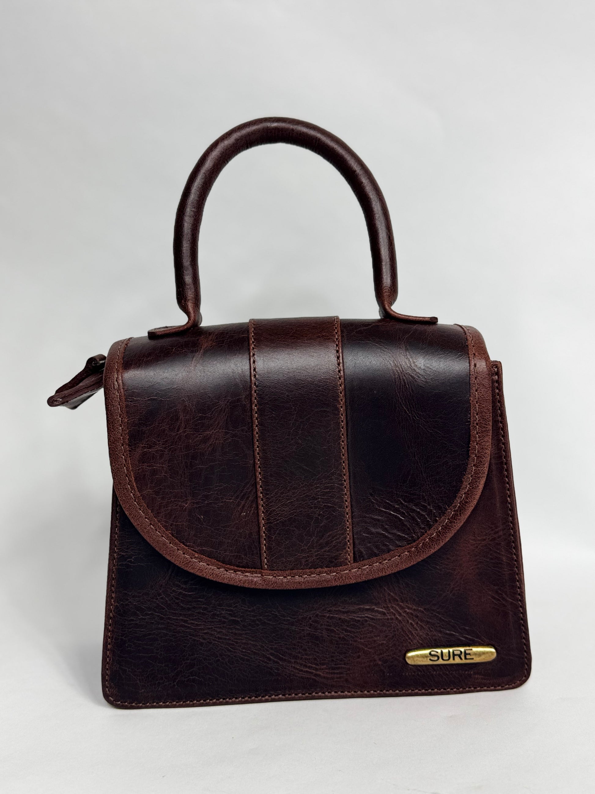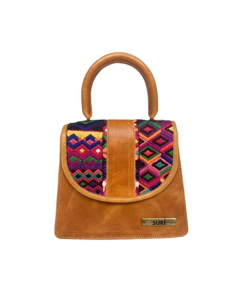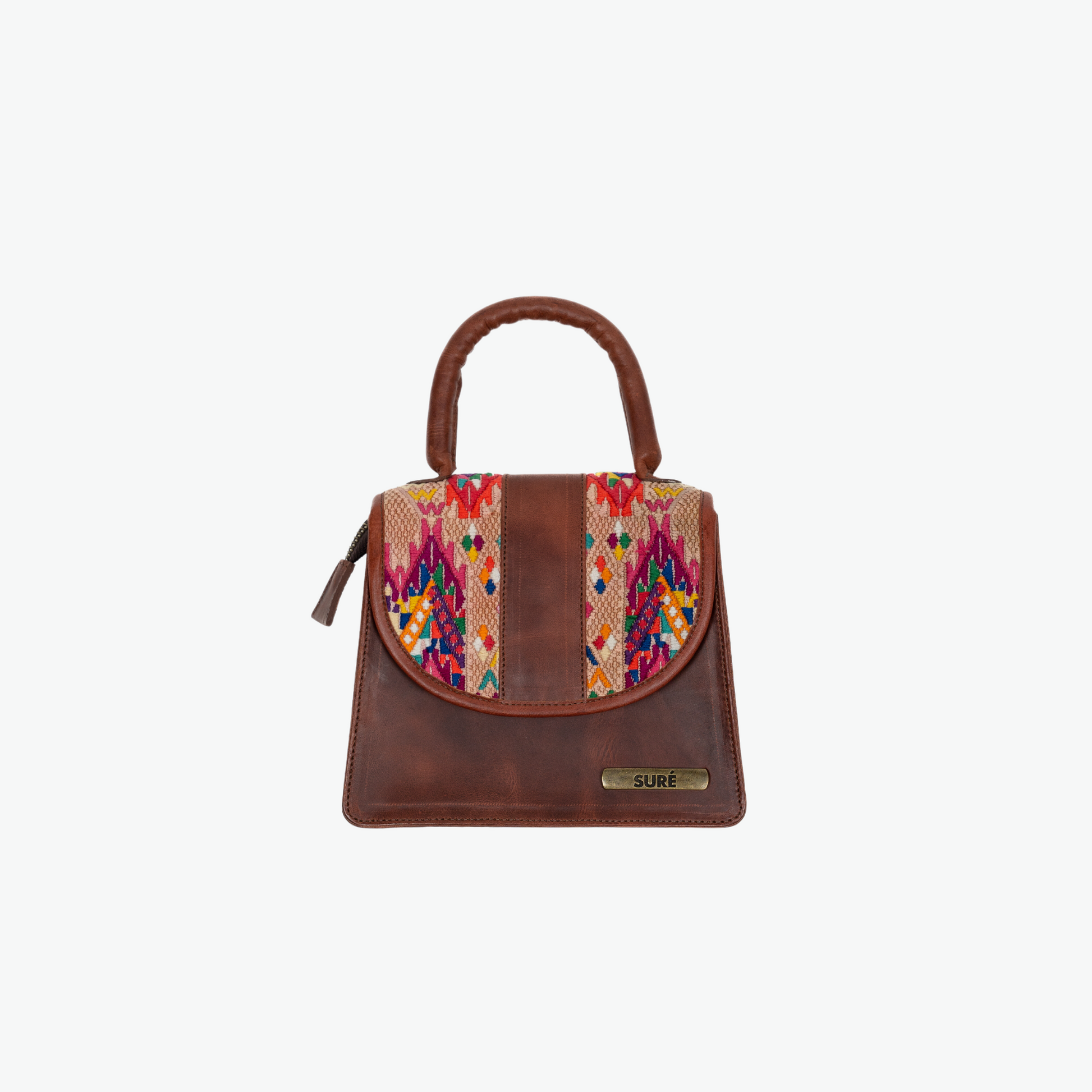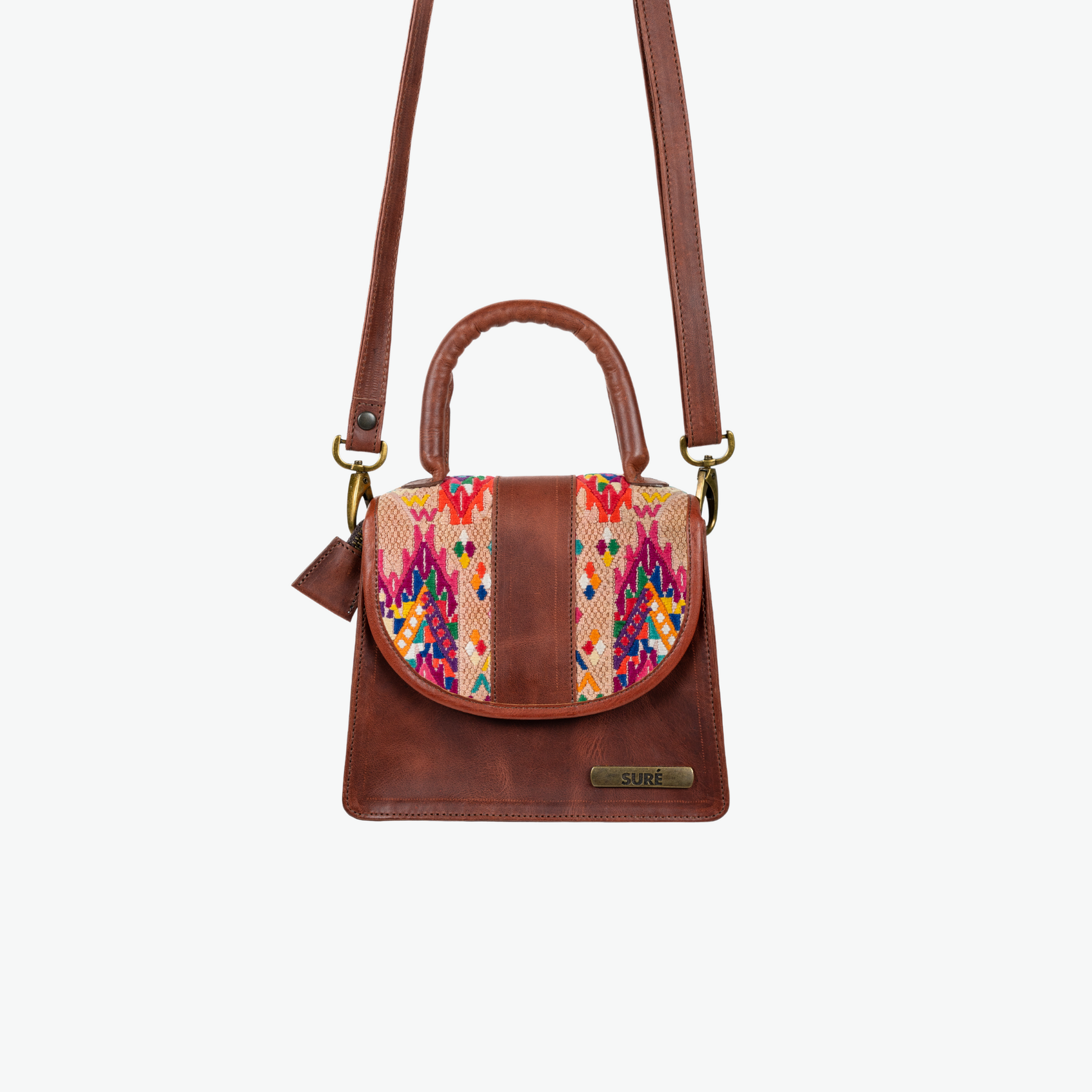 Handmade design in authentic brown leather with a brilliant huipil piece. Includes adjustable and detachable strap for customizable wear.